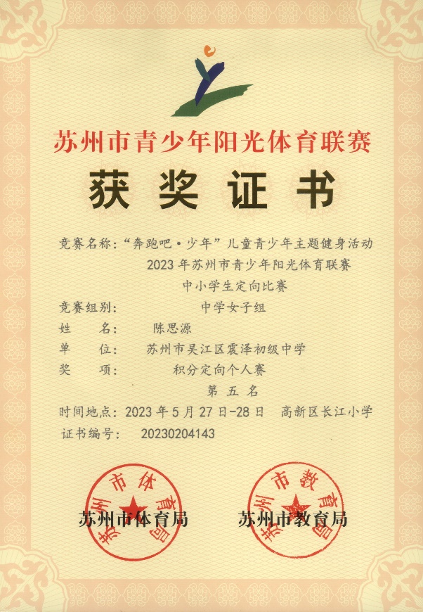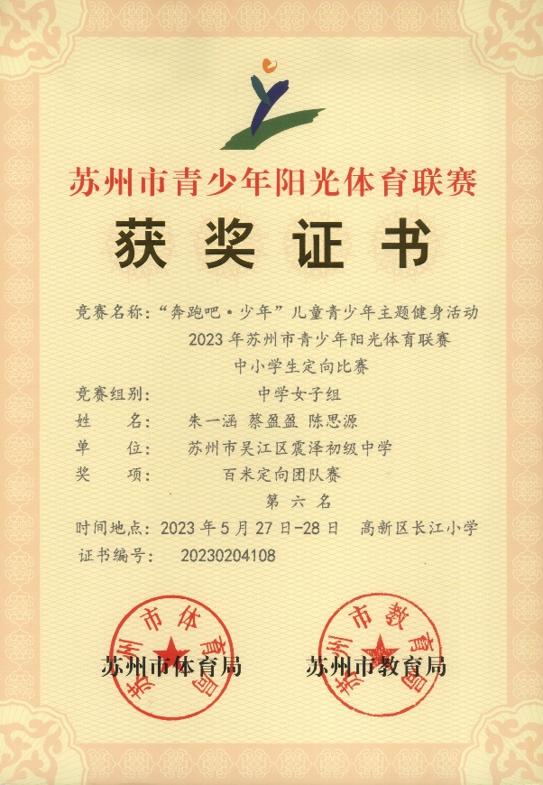2023年05月,由苏州市教育局、体育局联合主办的“奔跑吧·少年”儿童青少年主题健身活动暨2023年苏州市青少年阳光体育联赛中小学生无线电测向、通信、定向等多个子赛项。在定向比赛中学女子组百米定向团队赛(蔡盈盈、陈思源、朱一涵) 第6名(一等奖);中学女子组积分定向个人赛(陈思源) 第5名(一等奖)。