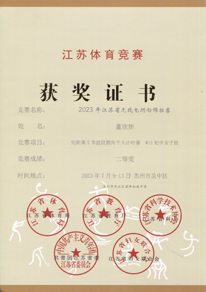 2023年江苏省无线电测向锦标赛短距离2米波段测向个人计时赛W15初中女子组(董欣妍) 二等奖;