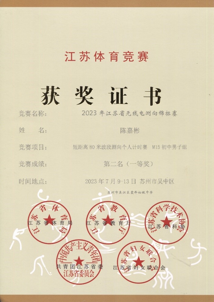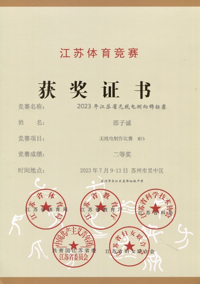 2023年07月中上旬,我校边缘智创社团部分同学,参加了由江苏省教育厅、体育局、科协、团省委、妇联等单位联合主办,江苏省无线电和定向运动协会等单位承办的“2023年江苏省无线电测向锦标赛”。在短距离80米波段测向个人计时赛M15初中男子组项目中,陈嘉彬同学发挥出色,获第2名(银牌、一等奖)的好成绩,取得了我校在此类赛事中省级奖牌的突破;当然其他同学也努力拼搏,取得了多个等级奖项,比如董欣妍、蔡盈盈同学在无线电制作项目中分获W15初中女子组第1、2名,另外还有: