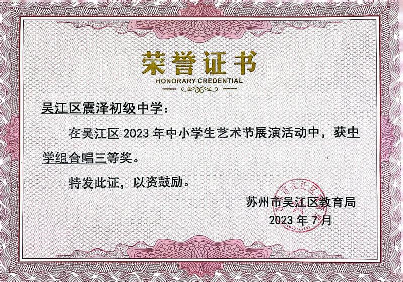 吴江区 2023 年中小学生艺术节作品评比活动中,我校合唱社团获得中学组合唱比赛三等奖。