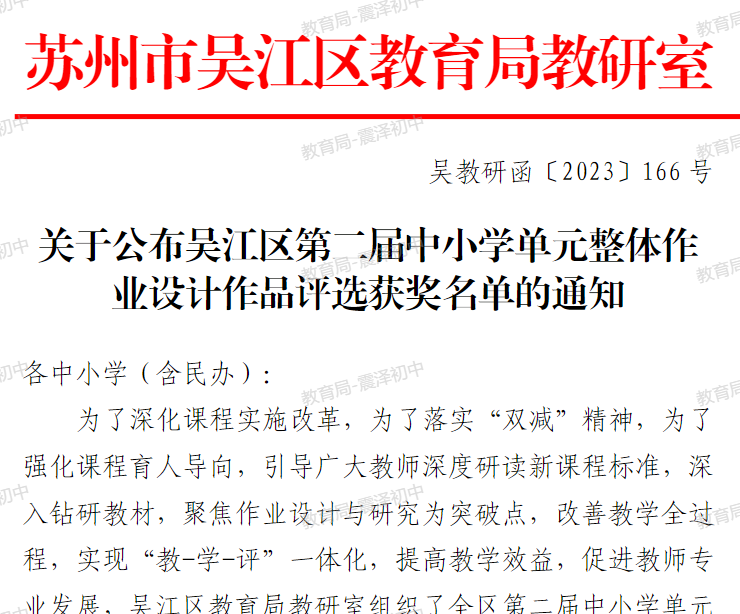 为了落实“双减”精神,为了强化课程育人导向,我校积极推荐教师参加作业设计评选活动,我校钱凌玲、杨爱红、陆丽芳的统编版九下历史第四单元设计获得吴江区第二届中小学单元整体作业设计作品评选二等奖。