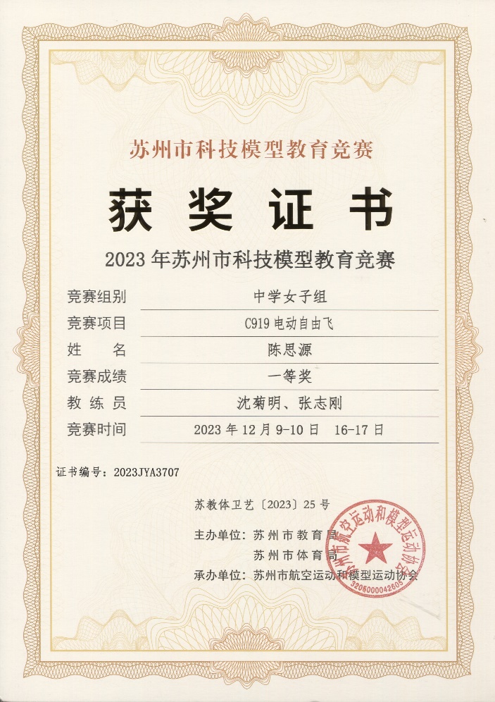 另有多项个人等级奖和单项团体前六名奖项,以及航空模型中学女子组综合团体第三名: