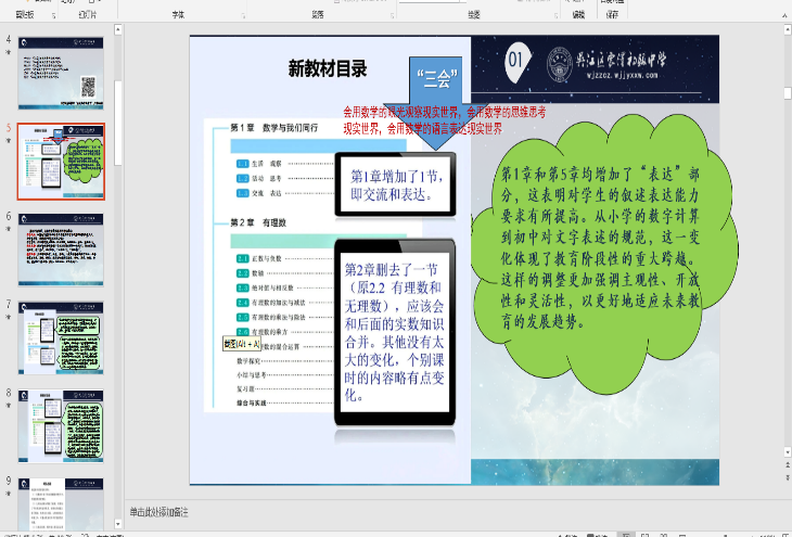 最后,蒋明祥副校长作了“读新教材·学新课标·研新思路”的微讲座, 初步总结了新教材结构和内容上的变化,希望老师们在教学中要适当加强数学思想方法的渗透,探索多元化的教学方法,强化代数推理意识的培养,促使学生学会思考、学会学习。