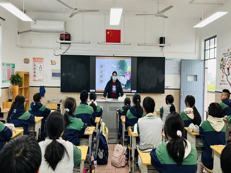 本次“廉洁在我心”主题班会活动为我校营造学廉、敬廉、思廉、保廉的良好氛围,帮助学生树立廉洁意识打下了良好的基础,进一步提高了广大师生廉洁诚信、遵纪守法的意识。同时在升旗仪式上德育处李文锋主任也就廉洁主题做了讲话。除此之外。我校为打造校园清廉文化阵地,利用广播、电子显示屏、宣传栏等媒介进行多渠道、多形式、多方位的宣传教育。同时,我校把校园清廉文化和学校特色活动相结合,先后开展了“廉洁文化在我心”警示片观看、黑板报评比、演讲比赛、问卷调查等系列活动。通过廉洁教育班会,同学们进一步了解了廉洁的深远意义。