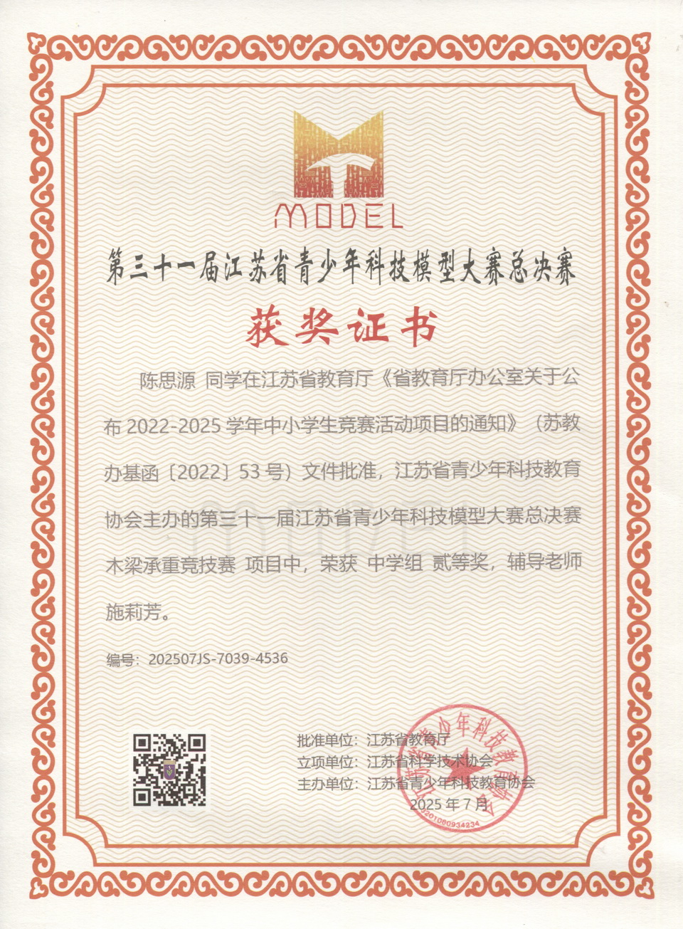 经过校内选拔后,于江苏省科技模型赛苏州选拔赛的木质桥梁承重竞技项目现场,充分运用力学知识,并发挥动手实践能力,取得了多个一、二等奖的成绩,并于随后的第三十一届江苏省科技模型赛中取得的省二等奖的成绩。
